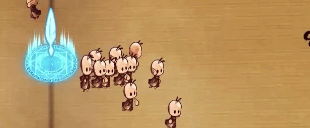 将卷轴上的〇△□等图形搬运至传送带上,在画布上进行组合即可制造小英雄。用不同的图形及颜色组合,即可制造出各种不同的小英雄。〇加△是人类,〇加□是妖精。将制造好的人类与□再进行组合就会变成盾兵。合成多个小英雄说不定还能制造出更高级的小英雄……?