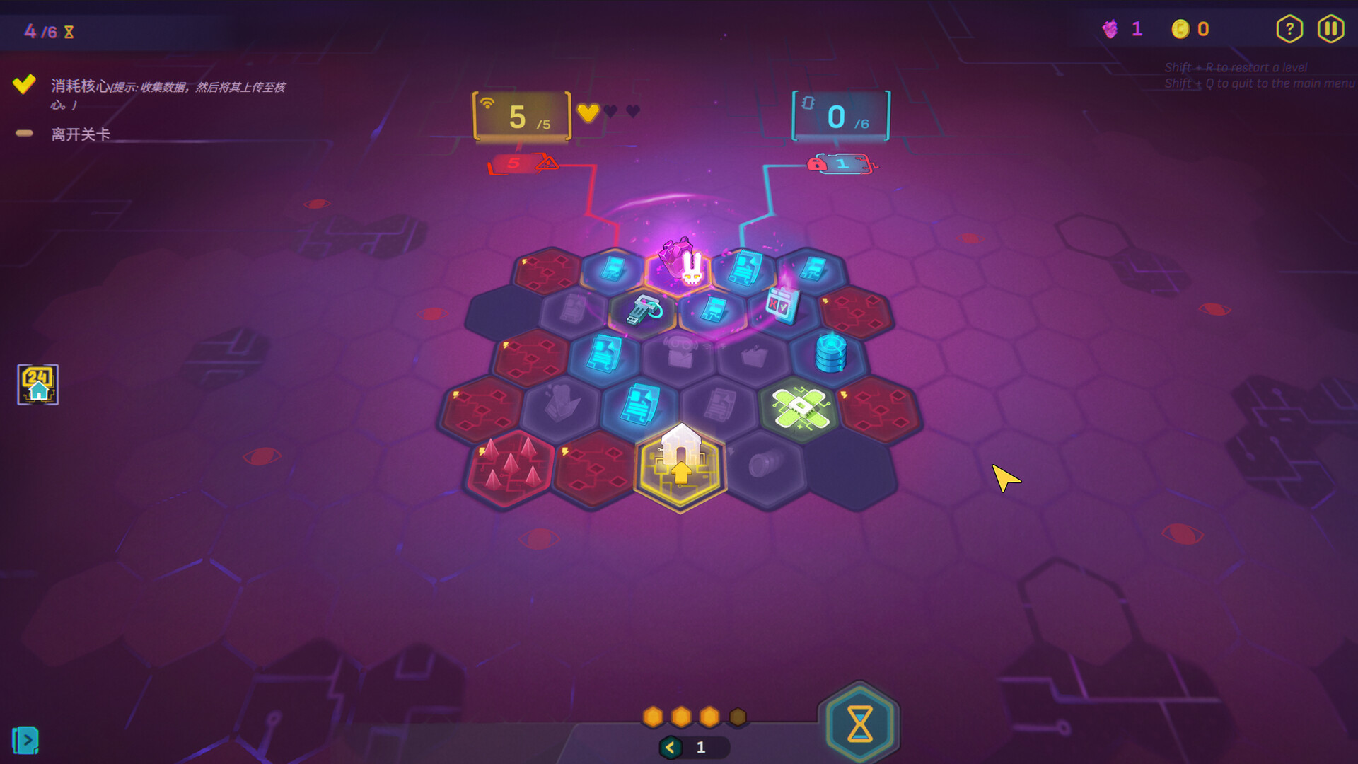 移动到六边形(节点)会激活并触发其效果。